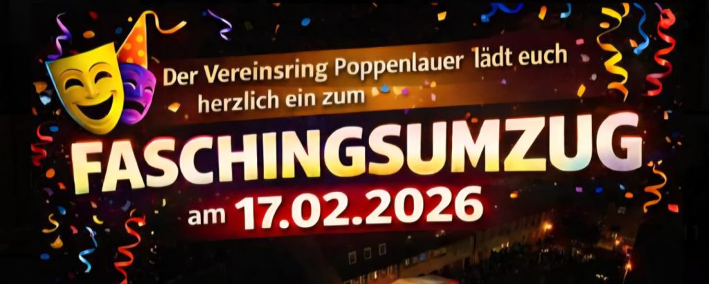 TermineFaschingszug 2026 Dominik Kaufmann / 8 Januar, 2026 Am 17.02.2026 findet wieder der Faschingszug in Poppenlauer statt. Es werden noch Helfer gesucht. Wer mitmachen möchte, gerne unter vereinsring-p@web.de melden